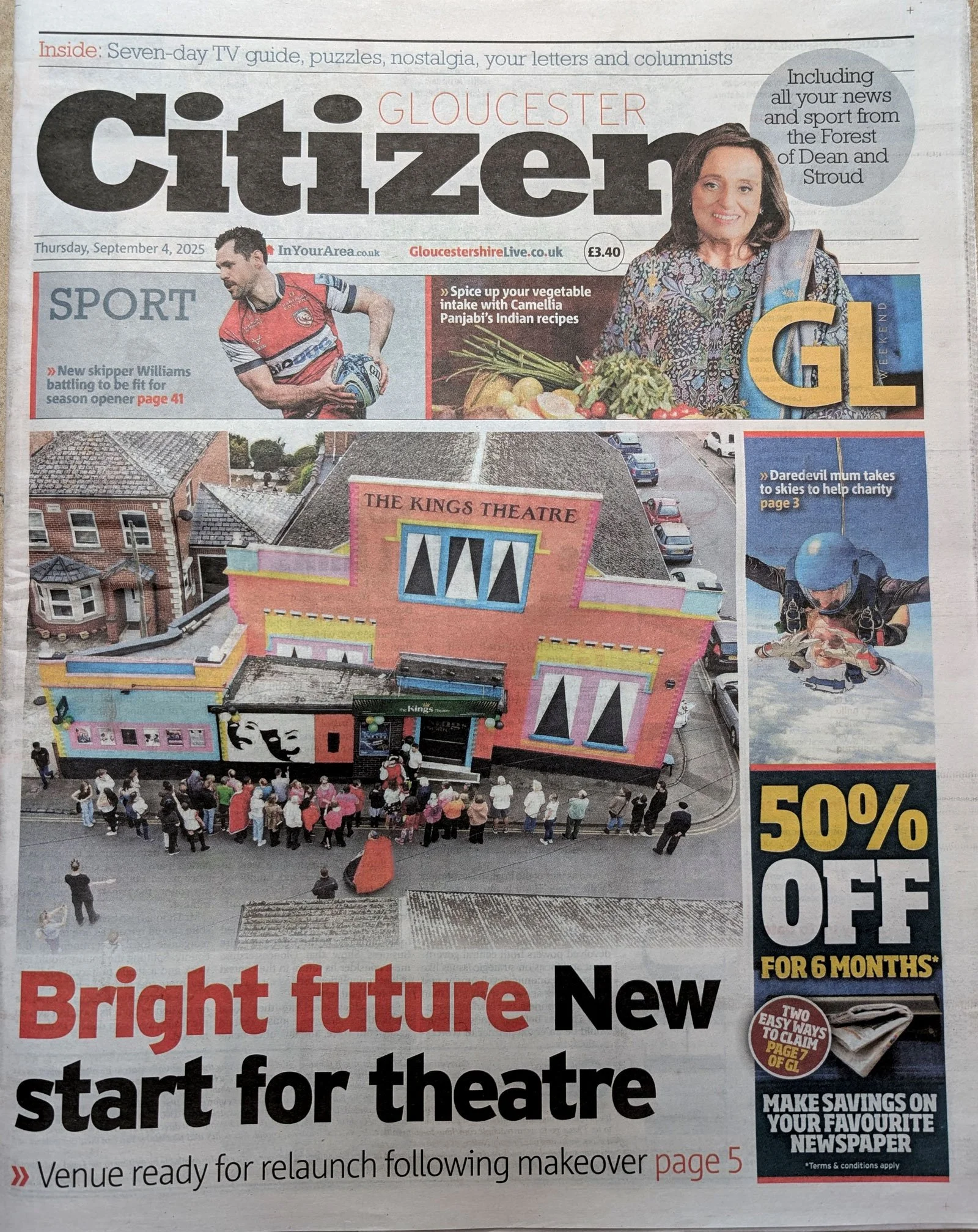 CITIZEN - Bright future new start for theatre All projectsKings Theatre 7 Sept Written By Harriet Peters Front page of the Gloucester Citizen: venue ready for relaunch following makeover… Harriet Peters